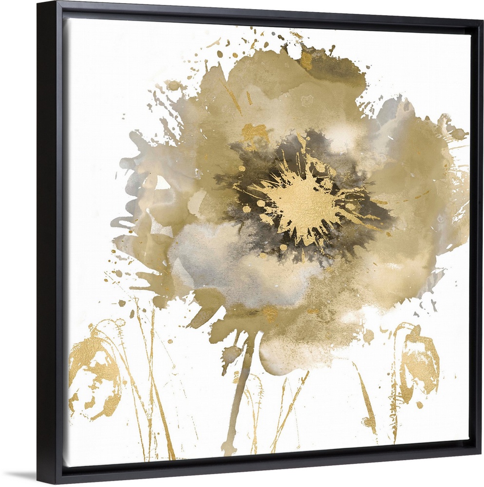 <p>Square decor with a single paint splattered flower in gold, silver, and black hues.</p>