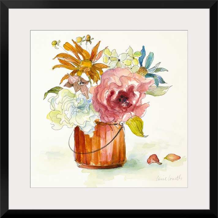 <p>Square watercolor painting of arranged wildflowers in an orange vase.</p>