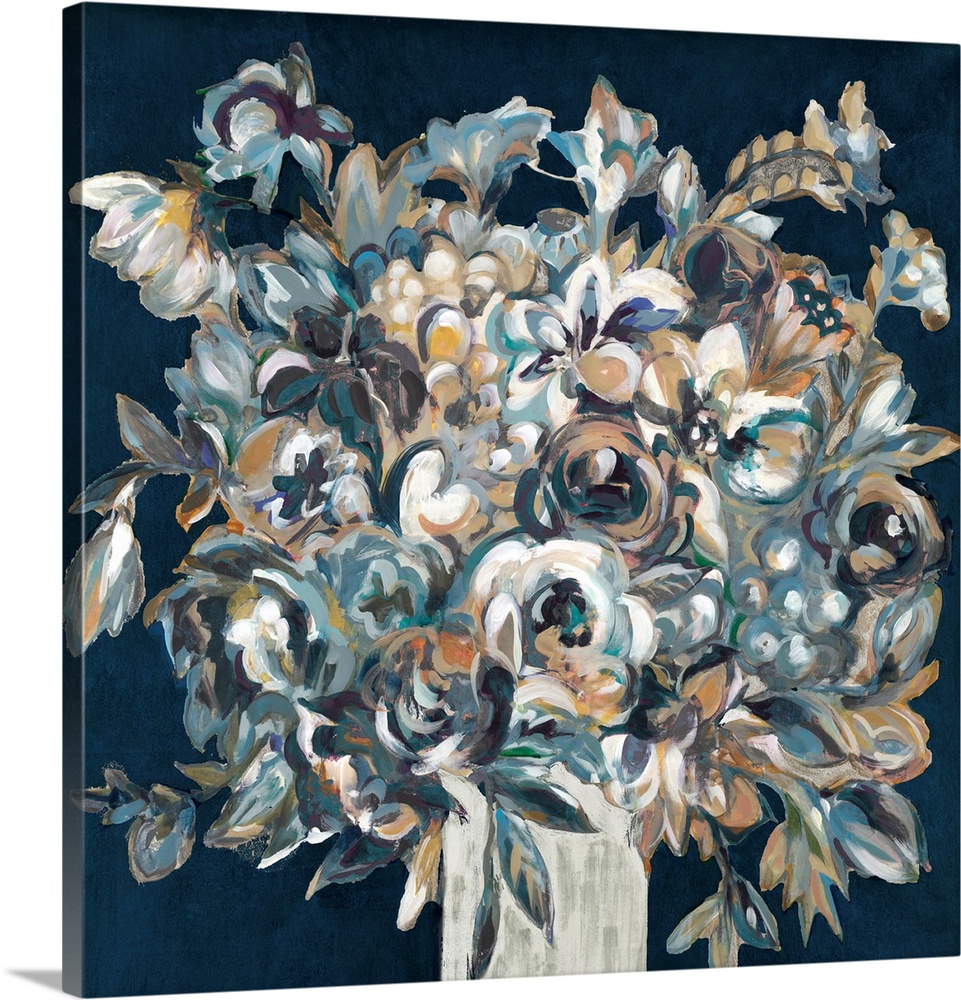 <p>Abstract-impressionistic floral bouquet in muted creams, blues, and tans, set against a dramatic deep teal background. Elegant and contemporary art for sophisticated interiors.</p>
