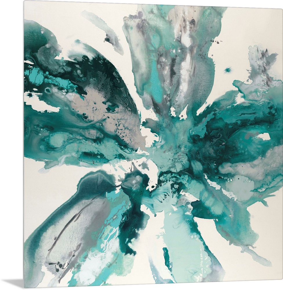 <p>Square abstract artwork with gray and teal hues marbling together in the shape of a flower on a white background.</p>