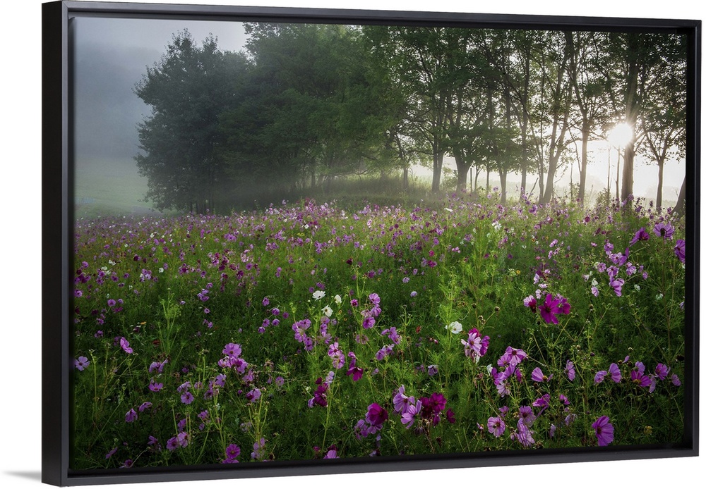 <p>Fine art photo of a field of pink flowers with morning sunlight shining through the trees.</p>