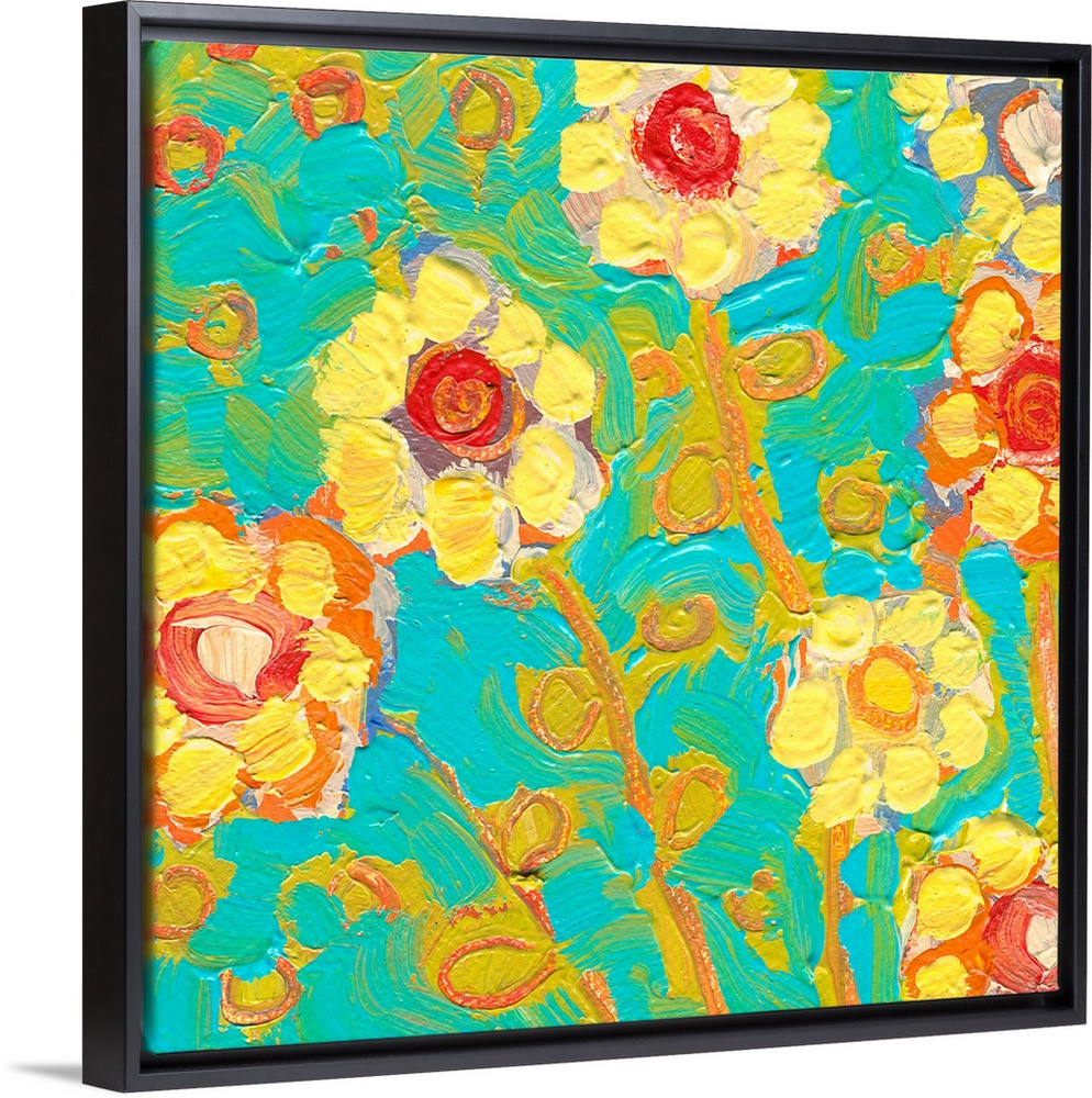 <p>Large painting of yellow flowers with a teal background. Brushstrokes are applied in various directions.</p>