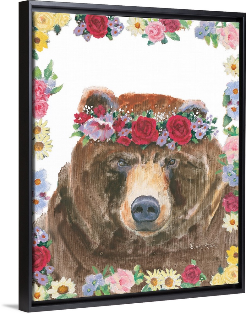 <p>Vertical artwork of a brown bear with a crown of flowers on it's head and a flowered border.</p>