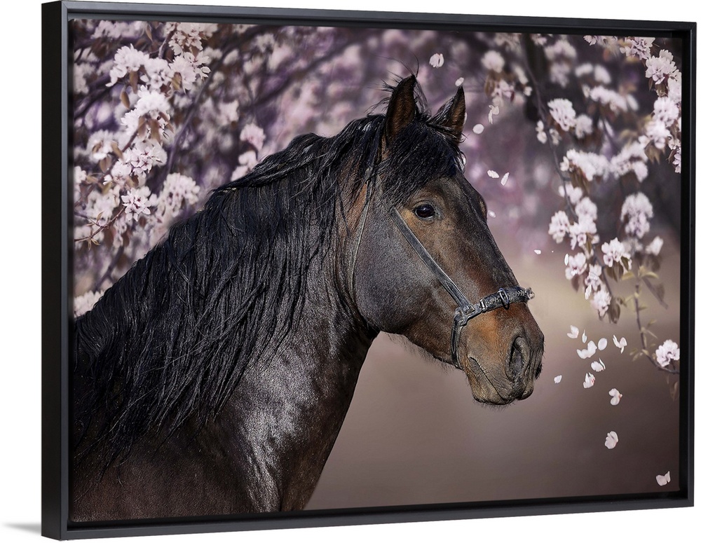 <p>A portrait of a black horse standing under a tree with pink blossoming flowers.</p>