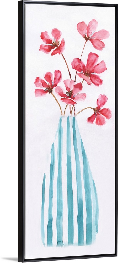 <p>Large panel watercolor painting of pink flowers arranged in a blue and white striped vase on a solid white background.</p>
