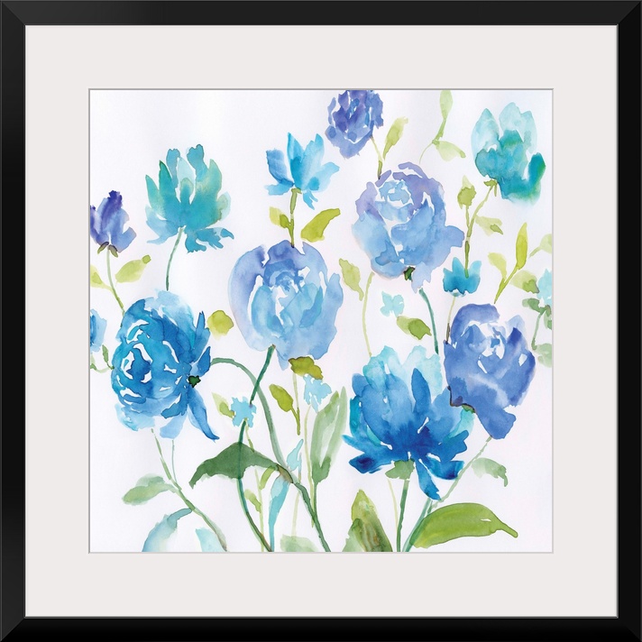 <p>Bright blue watercolor flowers with green leaves spring up against a white background.</p>
