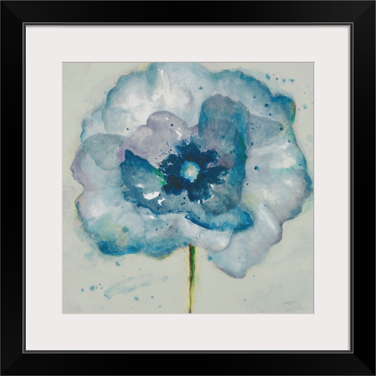 <p>Contemporary watercolor painting of a blue flower with a thin green stem.</p>