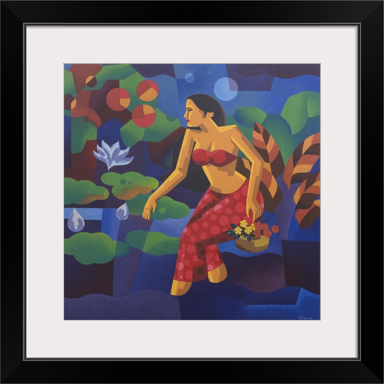 <p>'As symbol of love for God and all living beings, I painted a woman in a garden near the river. Her left hand holds a basket of flowers for today's offering and to decorate the house,' says Balinese artist Harman. His palette features glowing jewel-like colors.</p>