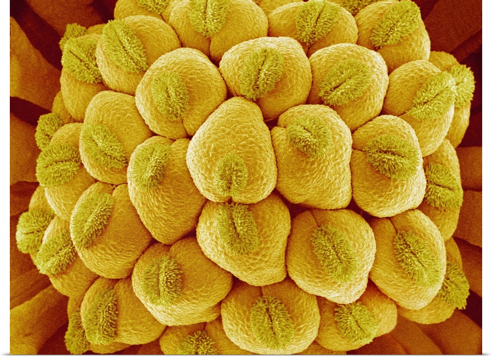 <p>Flower pistil. Coloured scanning electron micrograph (SEM) of a flower pistil. The pistil is the female reproductive part of the flower. It is made up of the ovary at the base of the pistil (bumpy structure), the style (projection) and the stigma (tip of projection). The stigma is where the pollen (male reproductive cells) land during pollination. The pollen can then fertilise the ovary at the base of the pistil.</p>
