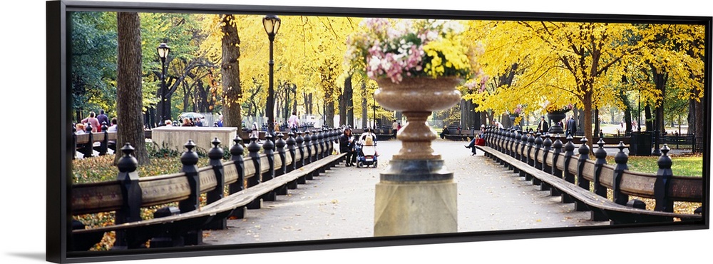<p>A large outdoor vase filled with flowers is photographed in the middle of a walking path that is lined on either side by benches.</p>