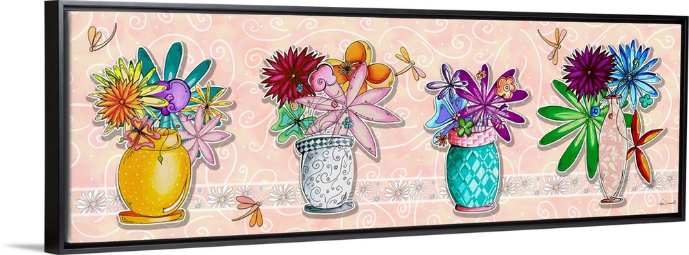 <p>Illustration of four bouquets of flowers in pretty vases in a row.</p>