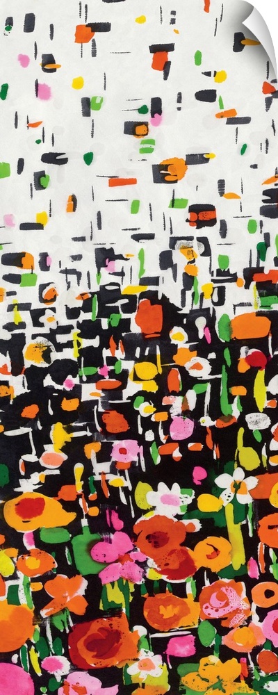 <p>Contemporary abstract painting of a bed of colorful flower with colorful geometric shapes cascading down from above.</p>