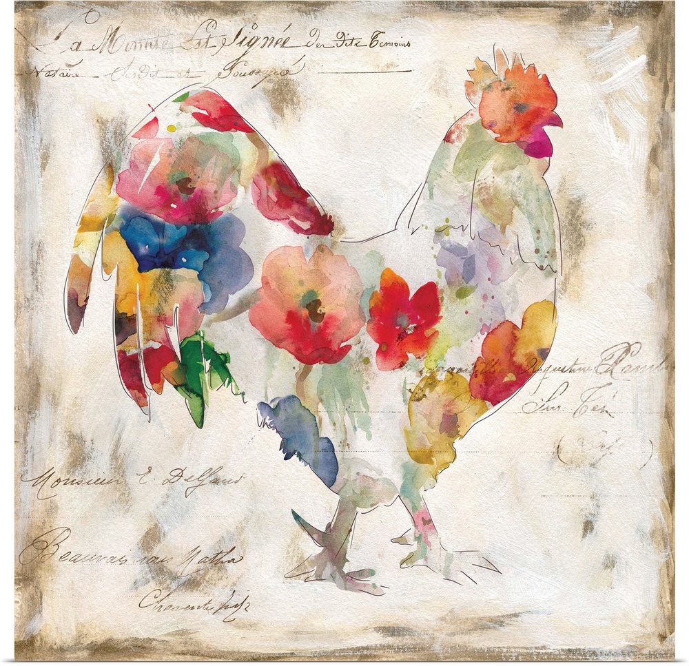 <p>Square decorative artwork of a rooster with a floral pattern against of aged, beige background with hand lettering.</p>