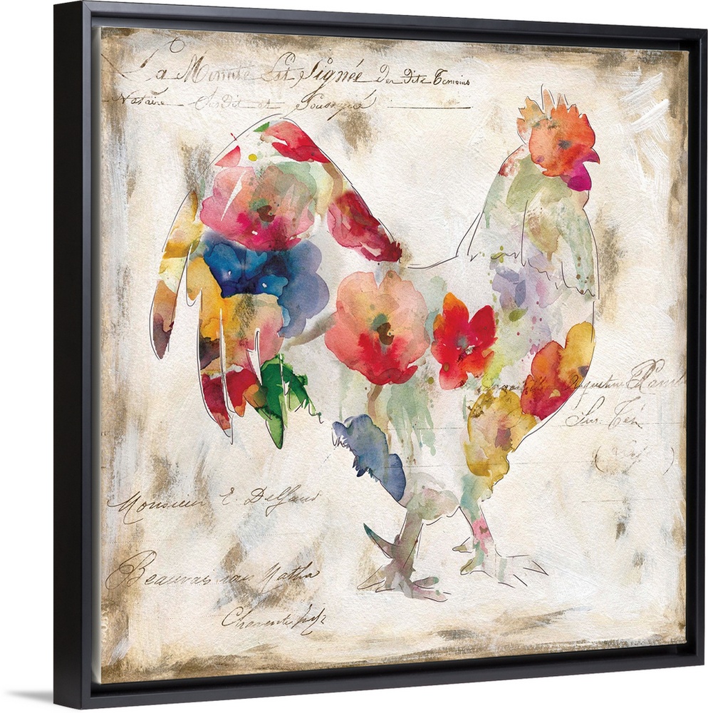 <p>Square decorative artwork of a rooster with a floral pattern against of aged, beige background with hand lettering.</p>