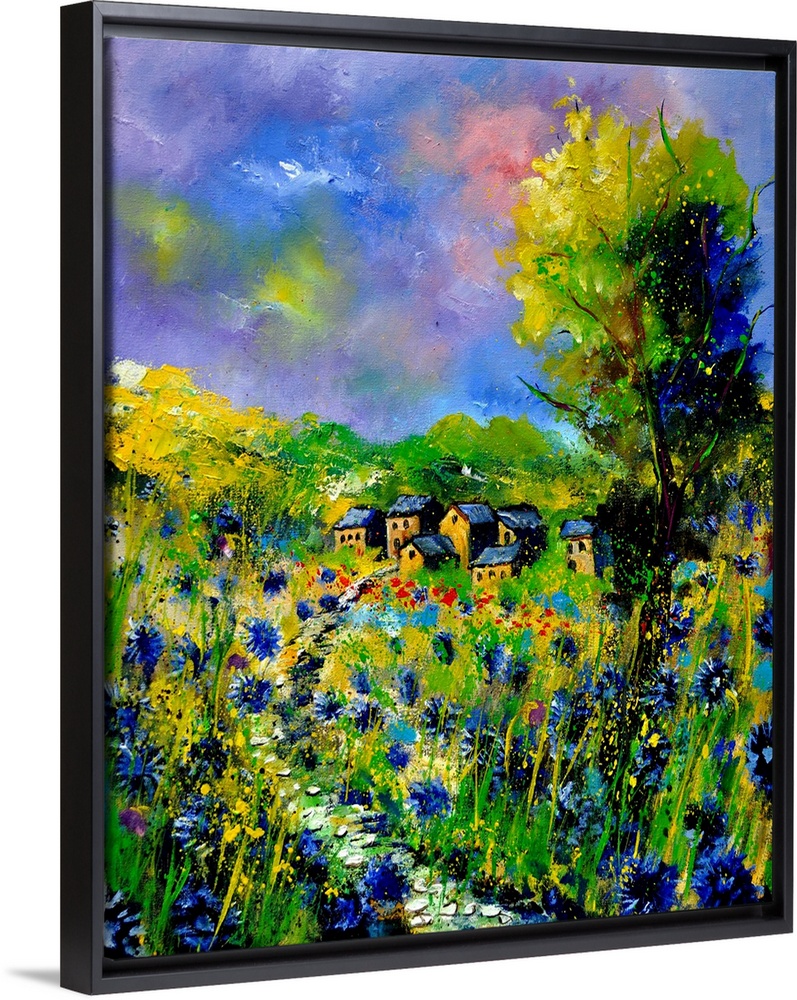 <p>Vertical painting of a field of flowers with a house in the background with splatters of multi-color paint overlapping the image.</p>