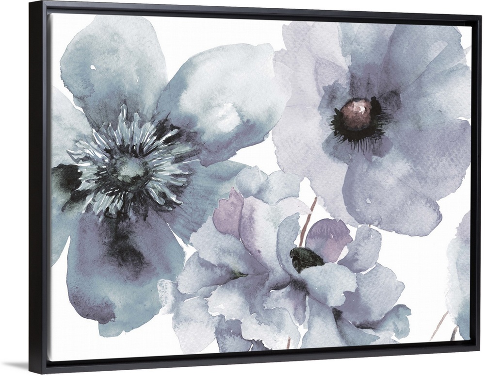 <p>Contemporary watercolor painting of pale blue flowers with broad petals.</p>