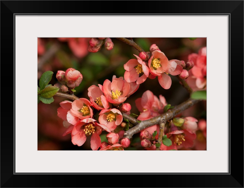 <p>Close up of a flowering branch of the Japanese dwarf flowering quince. Jamaica Plain, Massachusetts.</p>