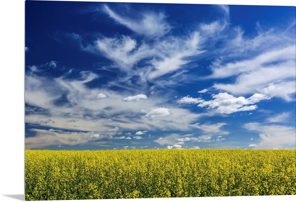 <p>Flowering canola field with dramatic white clouds and blue sky</p>
