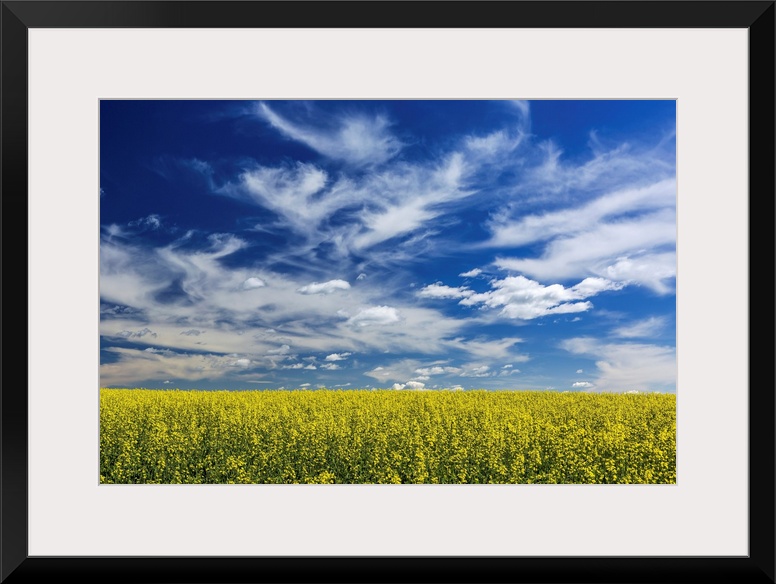 <p>Flowering canola field with dramatic white clouds and blue sky</p>