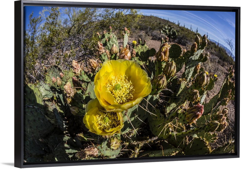 <p>Flowering prickly pear cactus (Opuntia ficus-indica), in the Sweetwater Preserve, Tucson, Arizona, United States of America, North America</p>
