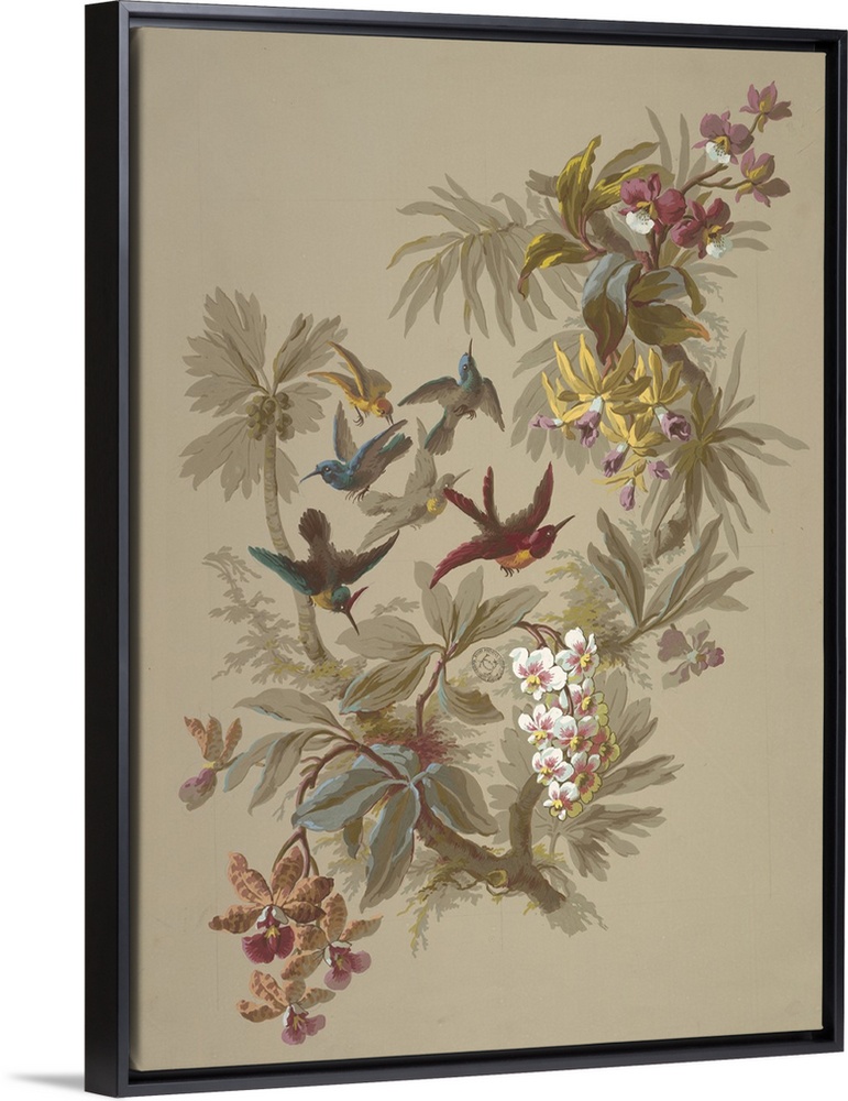 <p>Forked branch at center of page with foliage and various orchids and tropical flowers growing from it. Between the two branches of the fork six birds fly: three brown and green, one yellow, one gray, and one red and yellow.</p>