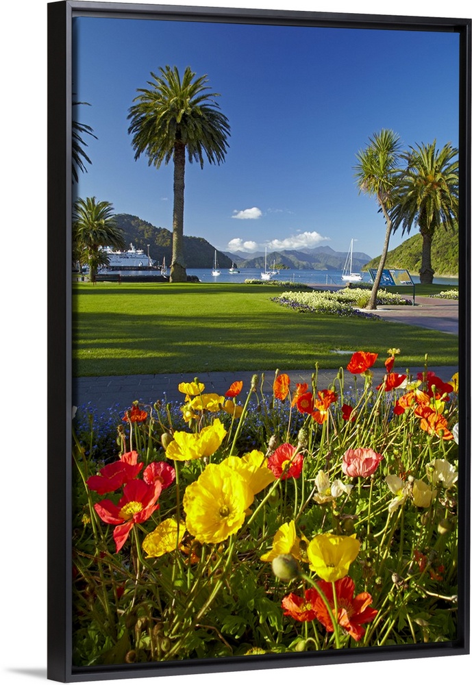 <p>Flowers and palm trees, Foreshore Reserve, Picton, Marlborough Sounds, South Island, New Zealand.</p>