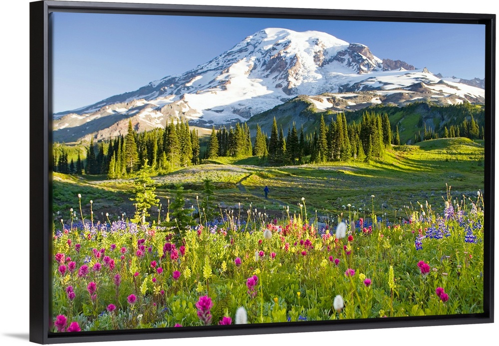 <p>Oversized, landscape photograph of a field of wildflowers including the purple arctic lupine (Lupinus arcticus), Magenta Paintbrush (Castilleja parviflora var. oreopola) and Beargrass (Xerophyllum tenax). Past a tree line in the background is a large, snow covered mountain.</p>