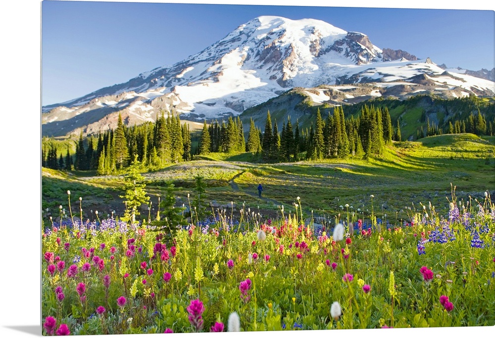 <p>Oversized, landscape photograph of a field of wildflowers including the purple arctic lupine (Lupinus arcticus), Magenta Paintbrush (Castilleja parviflora var. oreopola) and Beargrass (Xerophyllum tenax). Past a tree line in the background is a large, snow covered mountain.</p>