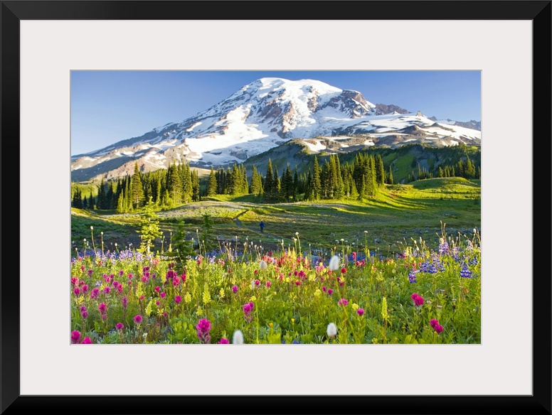 <p>Oversized, landscape photograph of a field of wildflowers including the purple arctic lupine (Lupinus arcticus), Magenta Paintbrush (Castilleja parviflora var. oreopola) and Beargrass (Xerophyllum tenax). Past a tree line in the background is a large, snow covered mountain.</p>