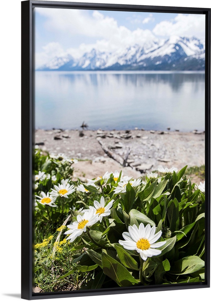 <p>Photograph of beautiful Spring flowers in front of Jackson Lake with the Grand Tetons in the background with a shallow depth of field.</p>