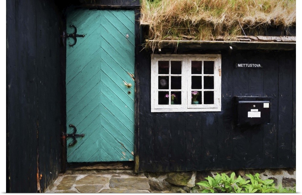 <p>The side of a black house with a turquoise door and white window frames.</p>