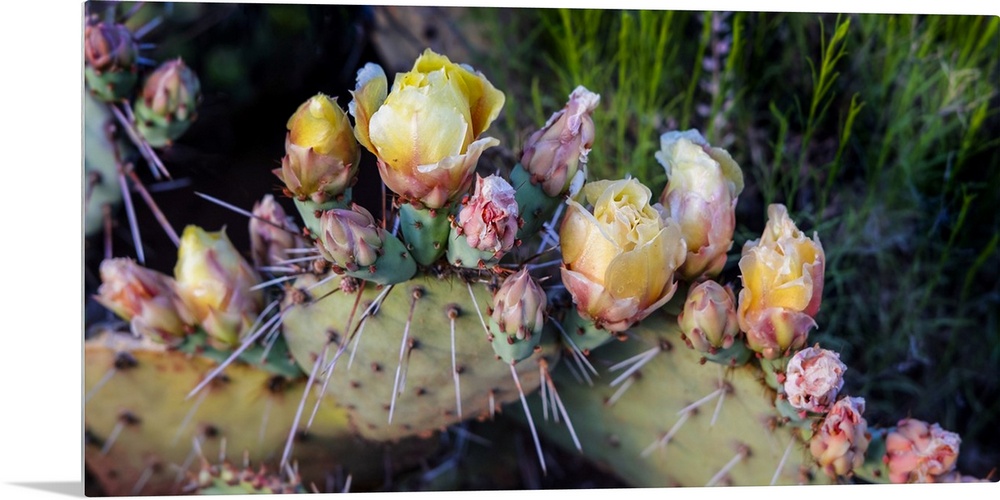 <p>Flowers blossoming on a Prickly Pear Cactus plant (Opuntia violacca) in late spring; Sedona, Arizona, United States of America</p>