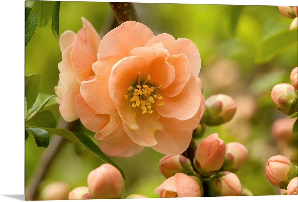 <p>Flowers, buds, and branches of Camellia reticulata, in springtime.</p>