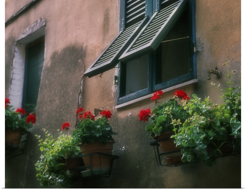 <p>Flowers decorate the wall beneath an open window in Italy</p>