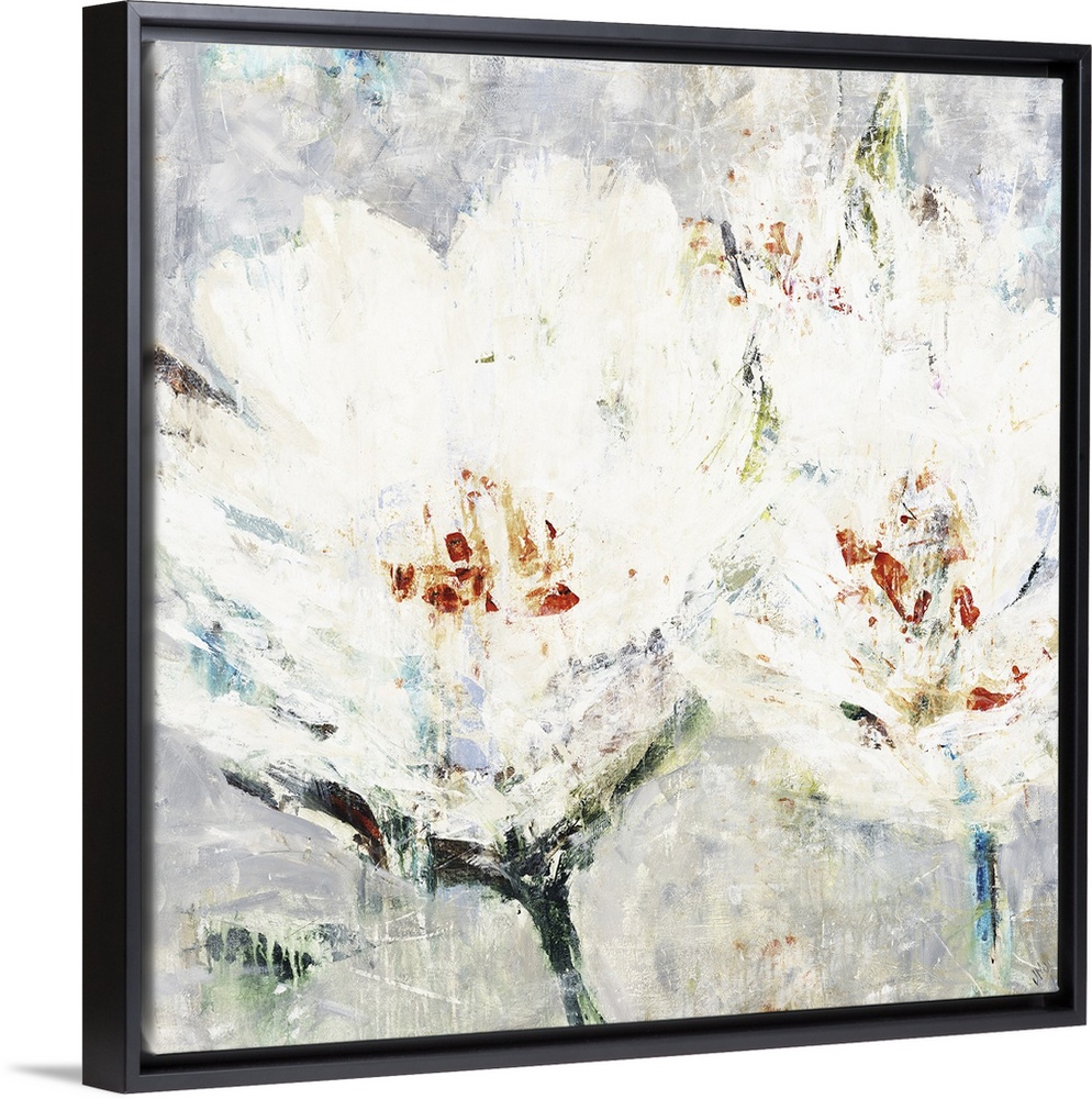 <p>Square artwork of two white flowers with orange accents in textured paint.</p>