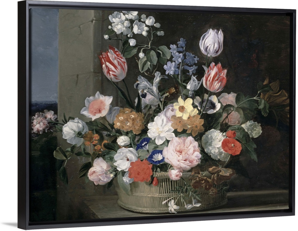 <p>Classical painting on canvas of a flower arrangement in a basket.</p>