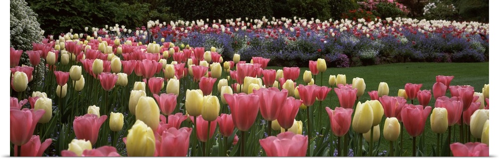 <p>Long horizontal photo on canvas of brightly colored tulips in a garden.</p>