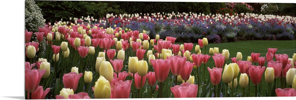 <p>Long horizontal photo on canvas of brightly colored tulips in a garden.</p>