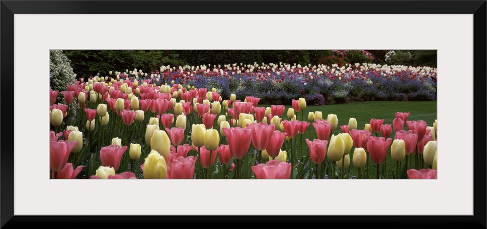 <p>Long horizontal photo on canvas of brightly colored tulips in a garden.</p>