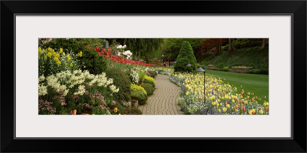 <p>Giant, landscape photograph of a brick path leading through vibrant flowers and shrubs, in Butchart Gardens at Brentwood Bay on Vancouver Island, British Columbia, Canada.</p>