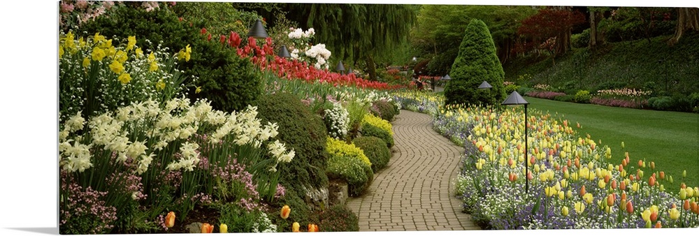 <p>Giant, landscape photograph of a brick path leading through vibrant flowers and shrubs, in Butchart Gardens at Brentwood Bay on Vancouver Island, British Columbia, Canada.</p>