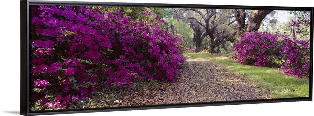 <p>Panoramic photo print of flowering shrubs in a garden with big trees in the distance.</p>