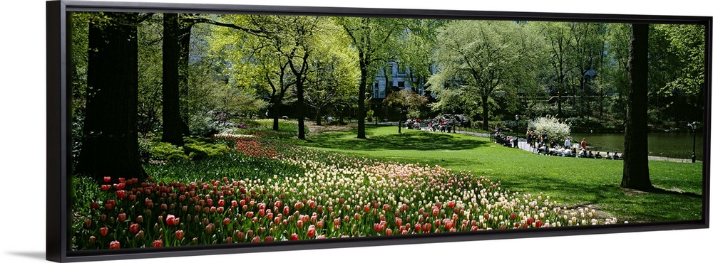 <p>Wide angle photograph taken of a thick strip of flowers that grow on a lush green field in Central Park.</p>
