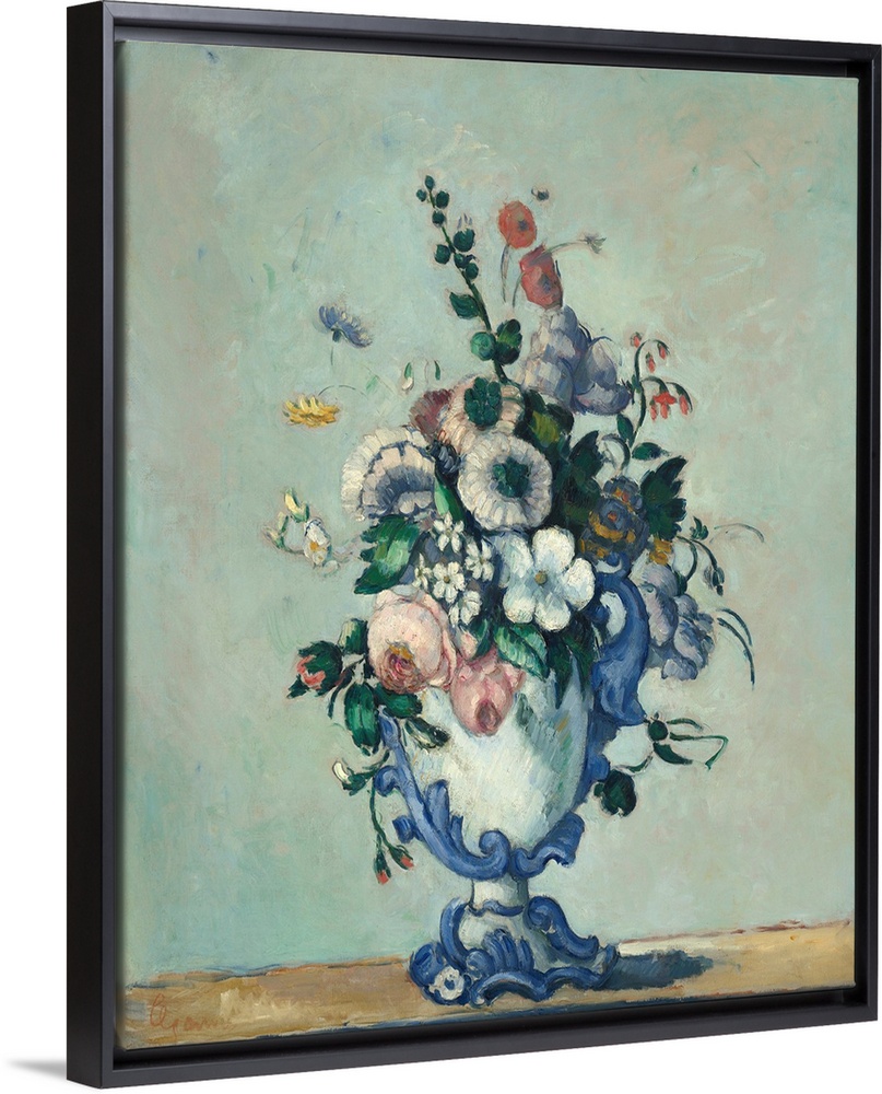 <p>Flowers in a Rococo Vase, by Paul Cezanne, 1876, French Post-Impressionist painting, oil on canvas. Cezanne's pallet became lighter from the influence of the Paris impressionist painters. He exhibited with the Impressions in 1874 and 1877</p>