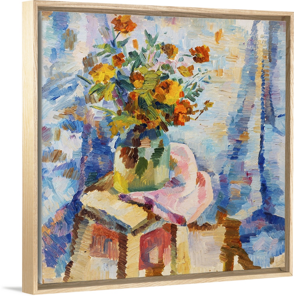 <p>Originally an oil painting flowers in a vase in bright orange colors of red and blue on canvas.</p>