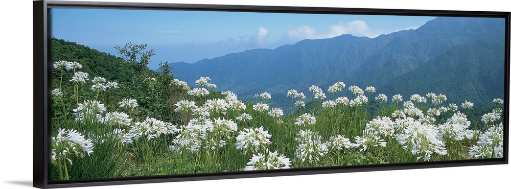 <p>Panoramic photograph of large flowers in a vast, green meadow, in front of a mountain landscape in a n ecological park in Encumeda, Madeira, Portugal.</p>