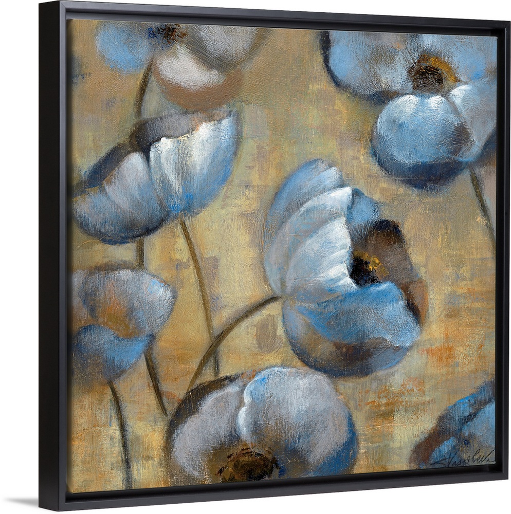 <p>Square, large floral artwork for a living room or office of large blooms at different angles, on thin stems, on a background of patchy, golden tones. Image has a very small, rough texture throughout.</p>