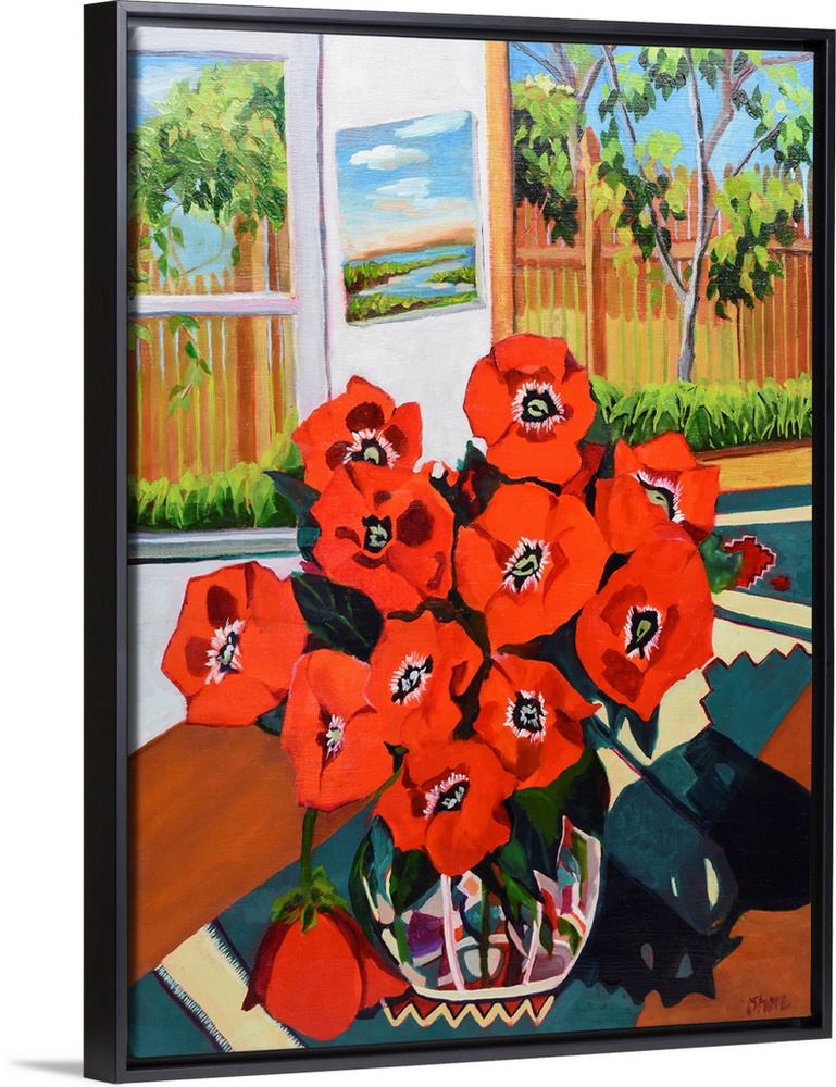 <p>Red potties in a glass vase with outdoor scenes visible through window.</p>