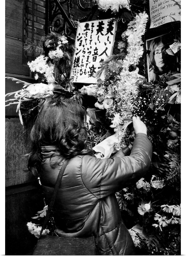 <p>Flowers in tribute to John Lennon in front of his home, the Dakota building, in New York, after his murder which took place on december 8, 1980.</p>