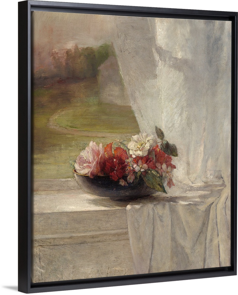 <p>Flowers on a Window Ledge, by John La Farge, 1861, American impressionist painting, oil on canvas. La Farge paints with a fresh mix of colors. Virtuoso brushwork captures the flowers, curtain, window ledge, background land, and sky</p>